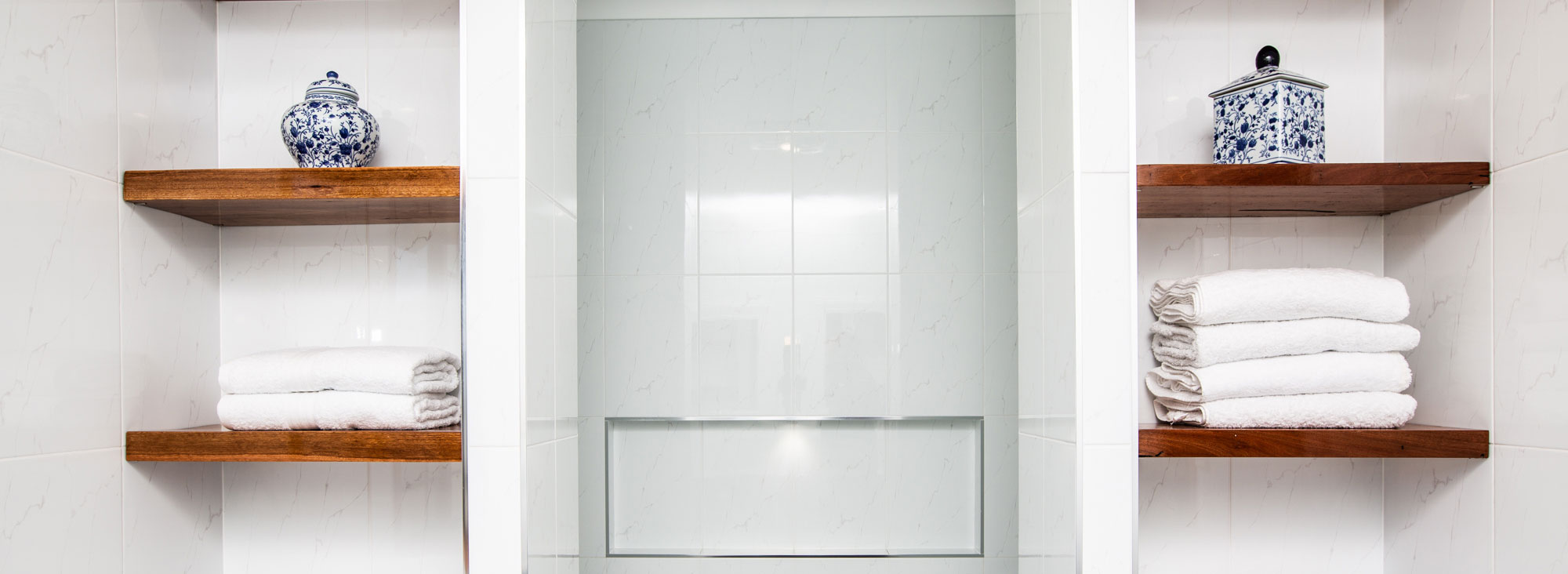 Beautiful Contemporary Design. This large ensuite was designed to be spacious and practical. It features a large double basin vanity with a granite top, beautiful old English style chrome tapware and re-furbished old timber slabs to make shelfs. It also features a walk-in open double shower with a central niche and built-in corner seat and hand-held combination shower rose on either end.